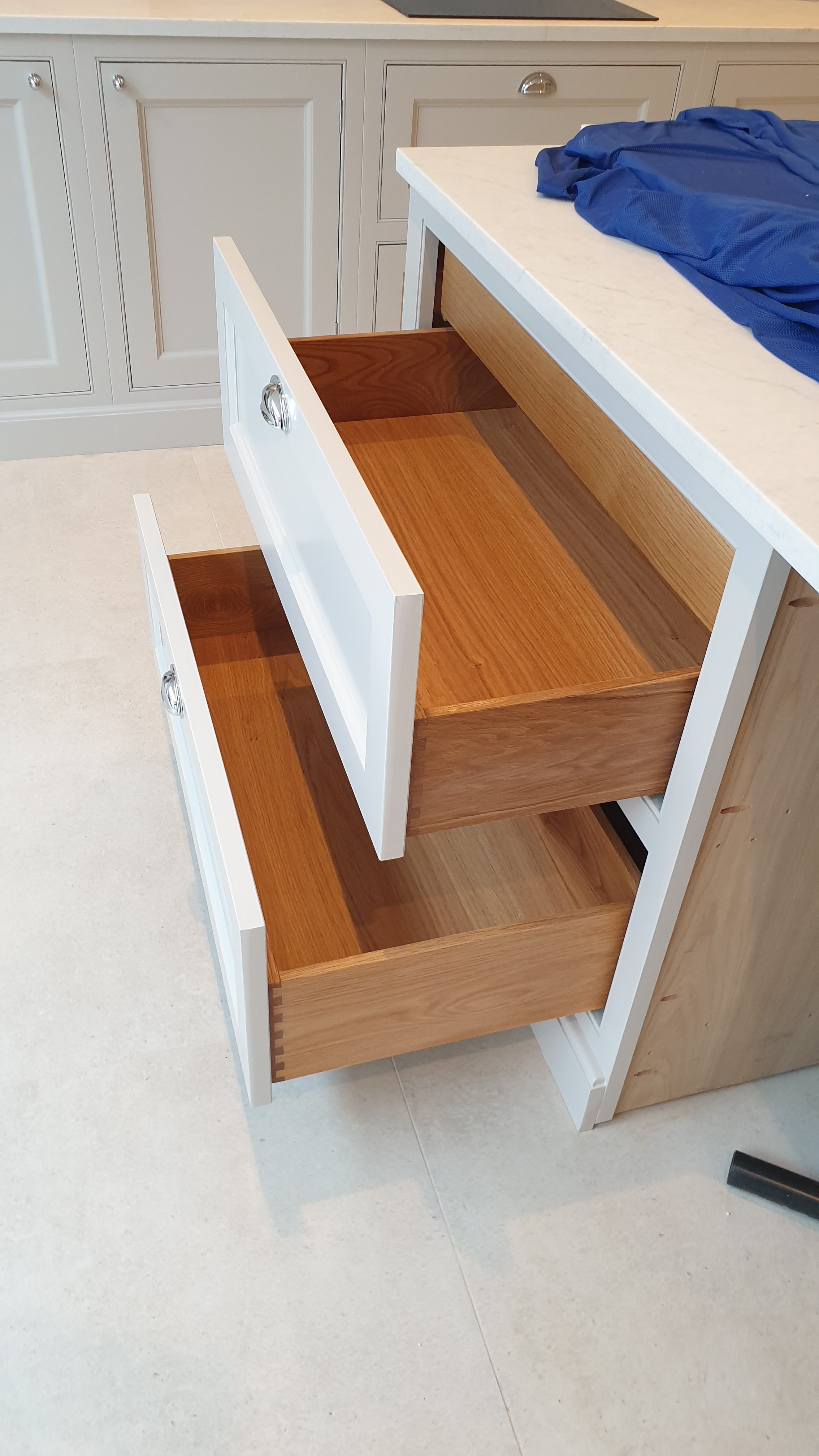 A lot of thought has gone into ways of leaving clients with the minimum of disruption. For me the anwser is to remove the doors & drawer fronts and take them away to my workshop. With the frames fully exposed and accessible, I apply the full “Prep and Paint” treatment to everything left in stiu. I then leave the clients in peace to complete the bulk of the work in my workshop . I keep everyone in the loop with process, and return to reinstall the kitchen, Finish any loose ends, Maybe fit new handles and leave the kitchen clean and ready for use.
