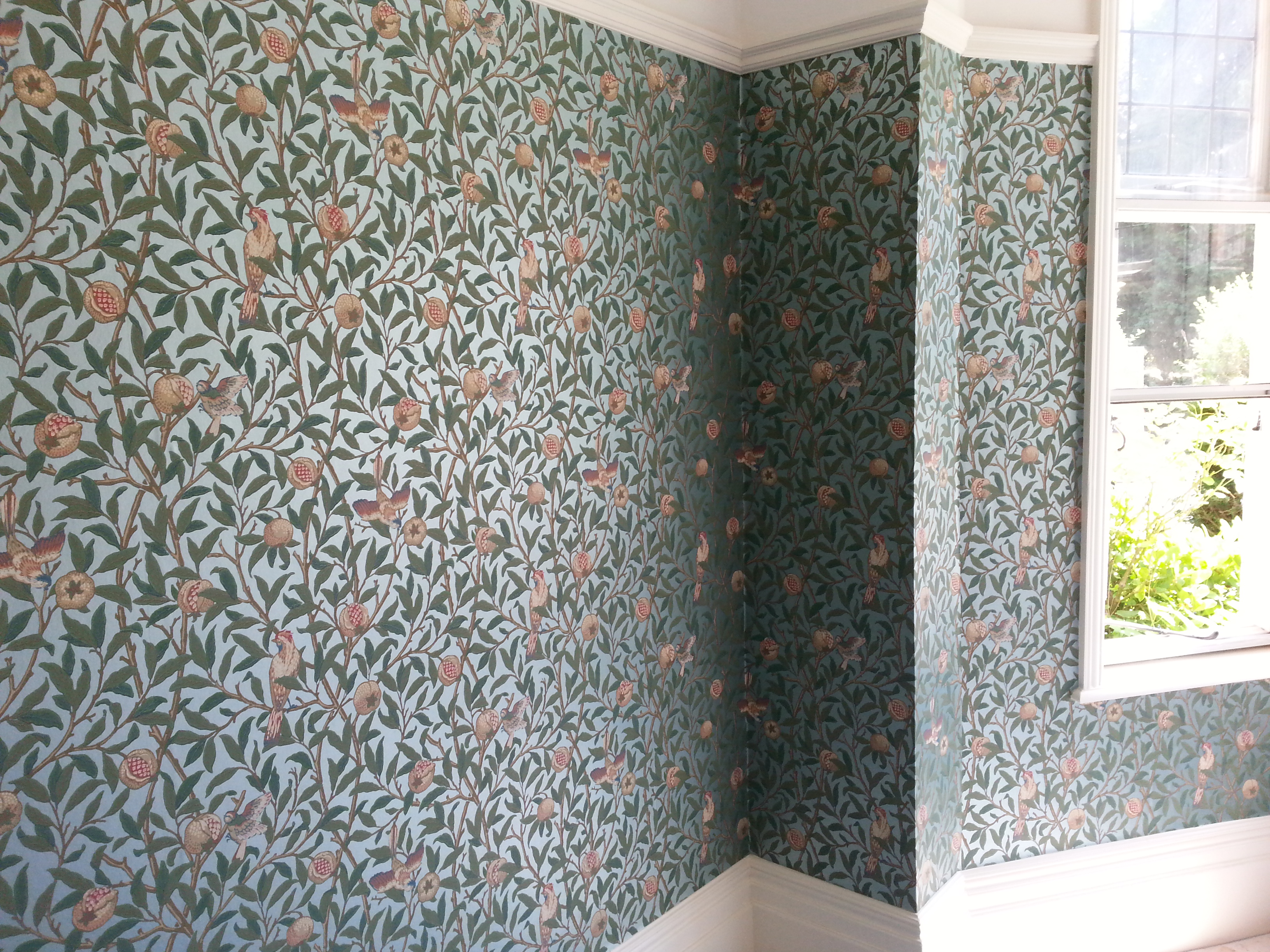 Thats where I came in the clients found me on the Traditional Painter.com web site after searching for a good paper hanger. My associate Decorator for Northamptonshire Paul Ian Barber went in first to prepare the walls to the standard required before cross lining with 1000 grade paper, This was allowed to dry for 48 Hrs, It was then down to me to hang all the finish wallcoverings to 4 bedrooms, Hallway & Music Room, There was a mixture of wallcoverings from the William Morris Archives and a couple of prints from the USA slightly wider then UK papers at 27 inches